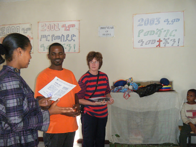 Our first order of business today was to go with Wanna to Peace Center in the Piazza district of Addis Ababa. This is the place where Moria'h staff goes every Tuesday through Friday morning to serve breakfast to many boys who live on the streets. Addis and Hana are the staff who lead this particular effort. Wanna explained to us that there are other places in the city where various charities provide food for street boys, but they don't offer the love of Jesus Christ with their meals. The boys who come to Peace Center, about 30 on this day, receive much more than food. They come because they are loved there, and they learn about Jesus...and they return day after day.